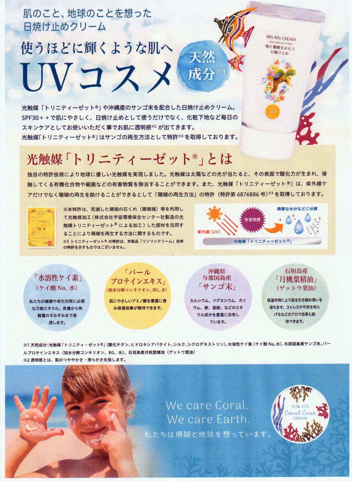 「リンリンクリーム」は、サンゴ礁に有害な成分を一切含まない、サンゴにも肌にも優しい日焼け止めクリームです。
