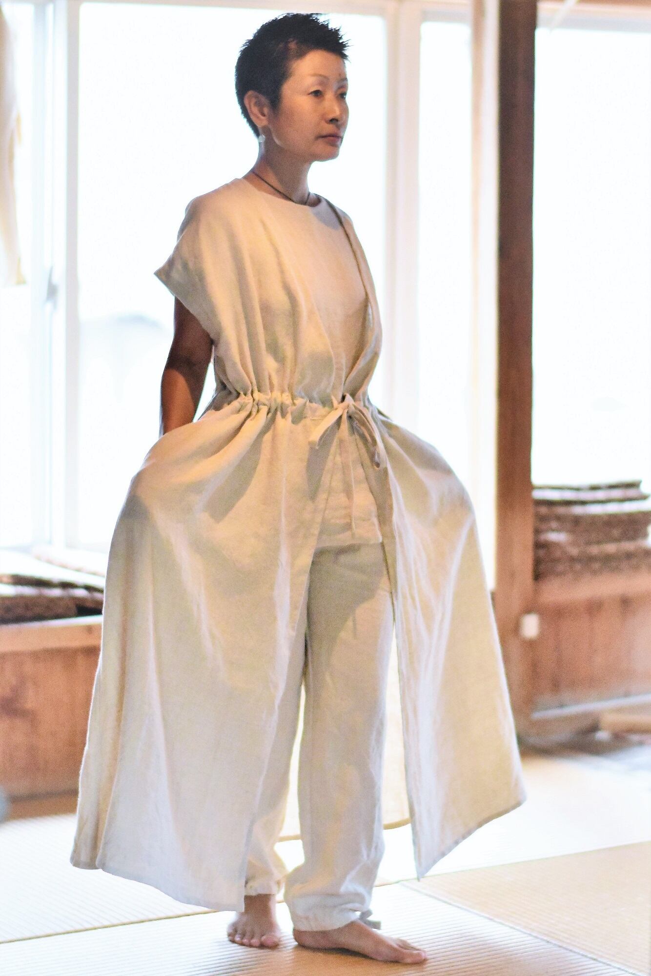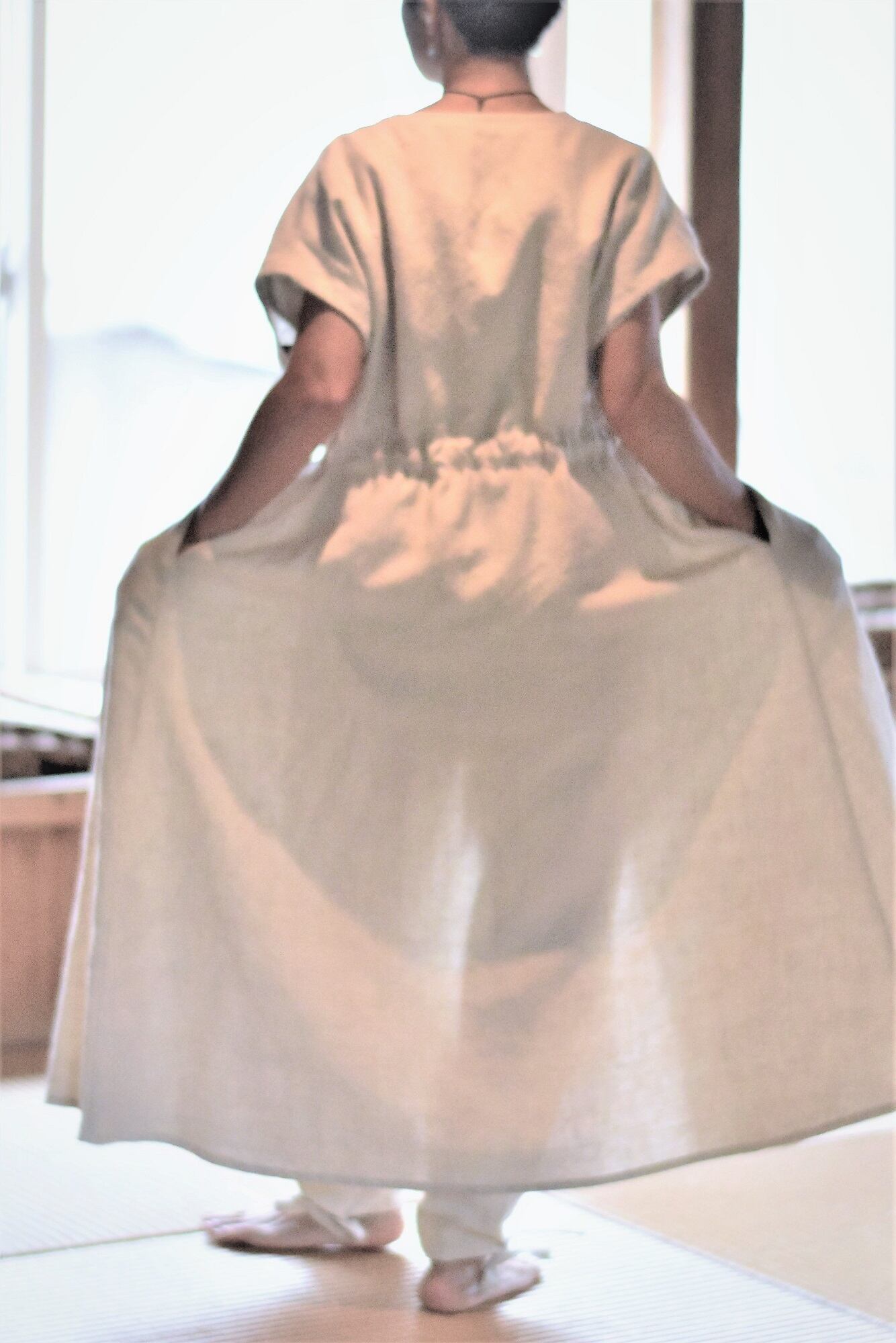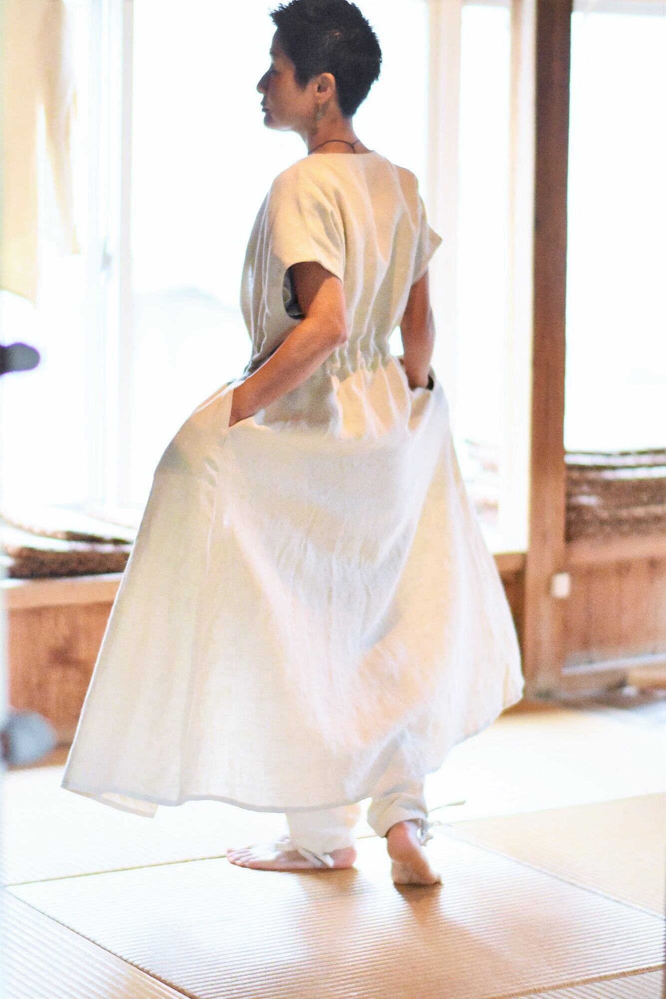 ヘンプ麻100%の天然素材が、肌に優しく、オールシーズン快適な着心地を実現。軽やかなシルエットが、動くたびに美しく揺れ、特別な一日を演出します。