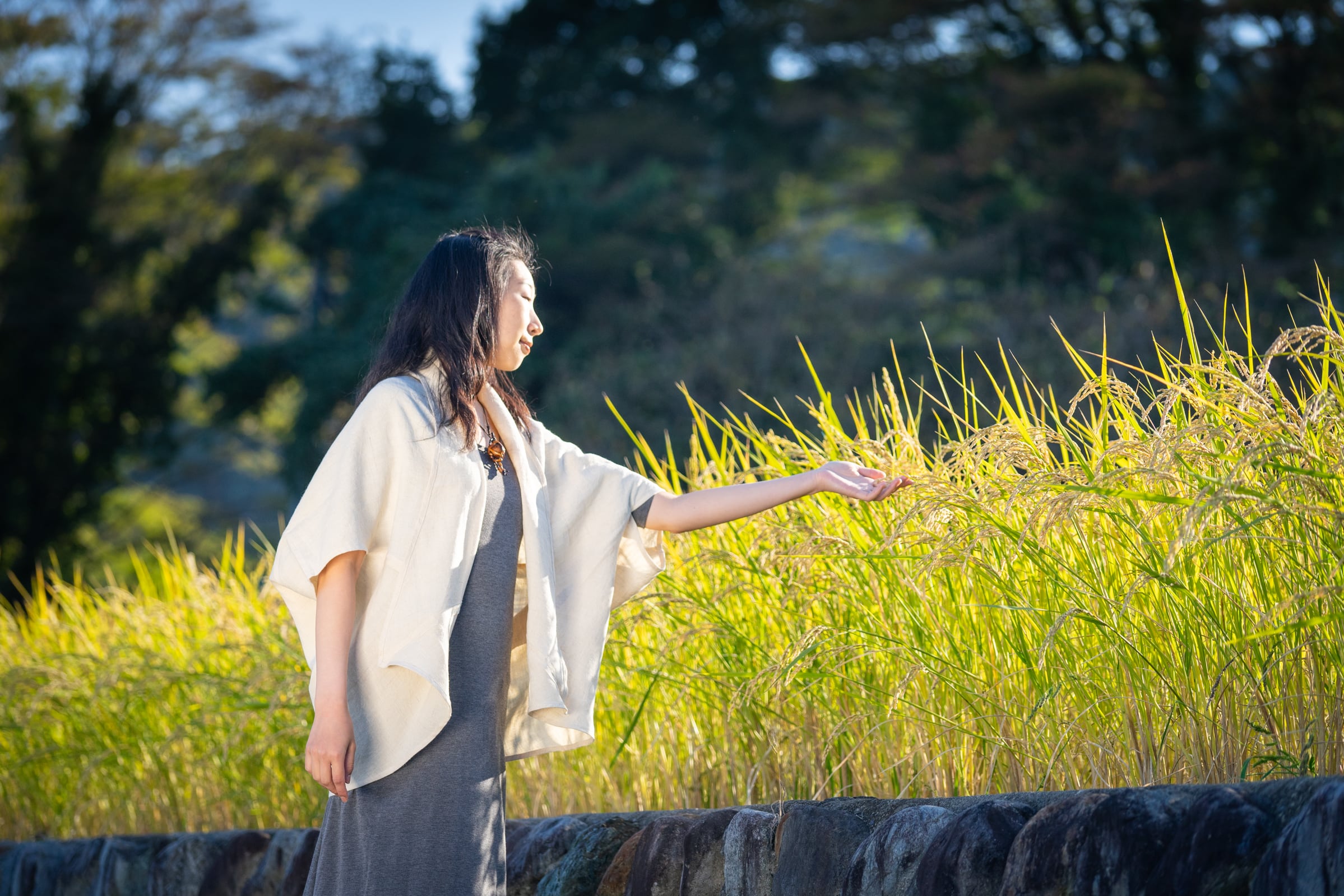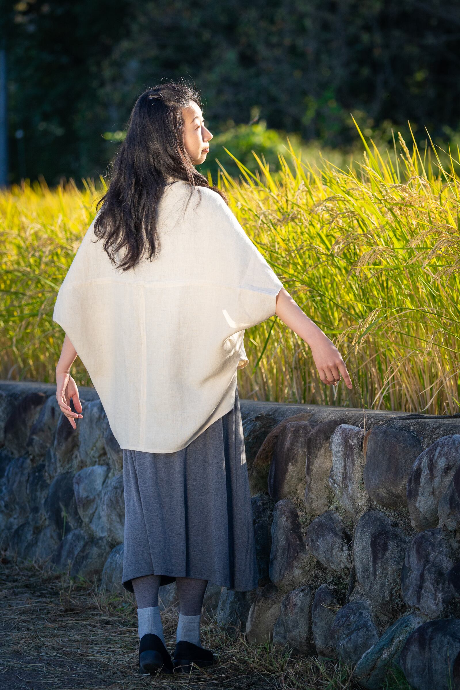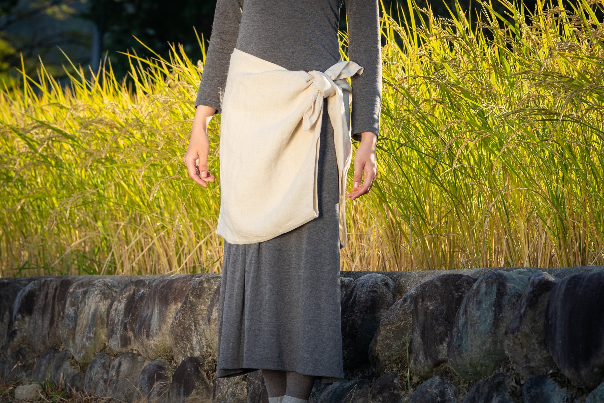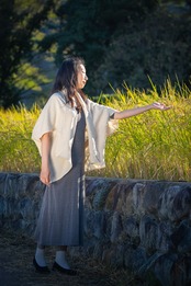 半分に折って肩に掛けるとショールにもなり、腰に巻くとオーバースカートにもなり、開けると羽織物にもなる優れもの!